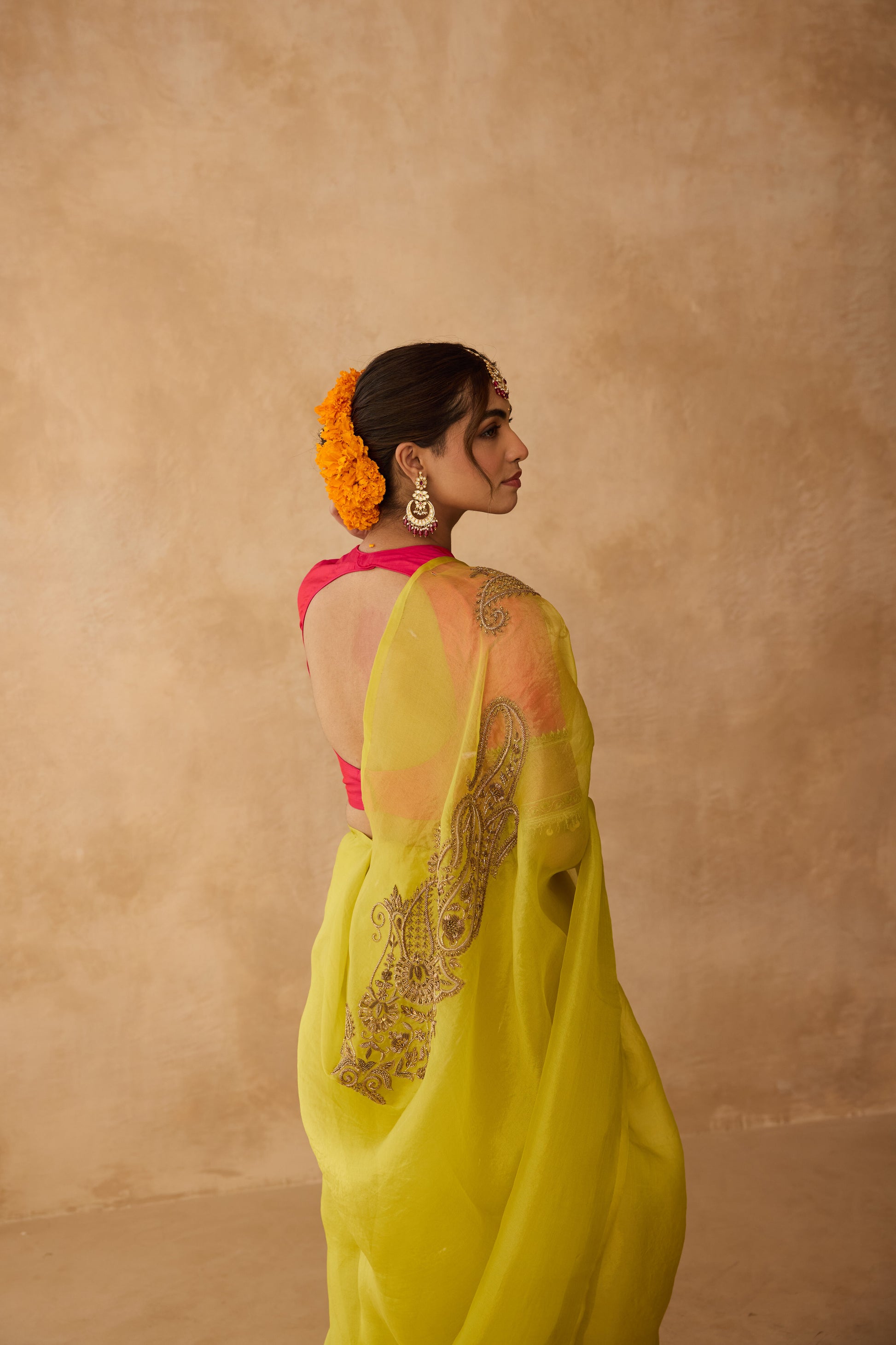 A sheer lime organza saree brought to life with delicate zardosi embroidery that catches the light beautifully. Fresh, airy, and made for sunlit moments and quiet celebrations.
