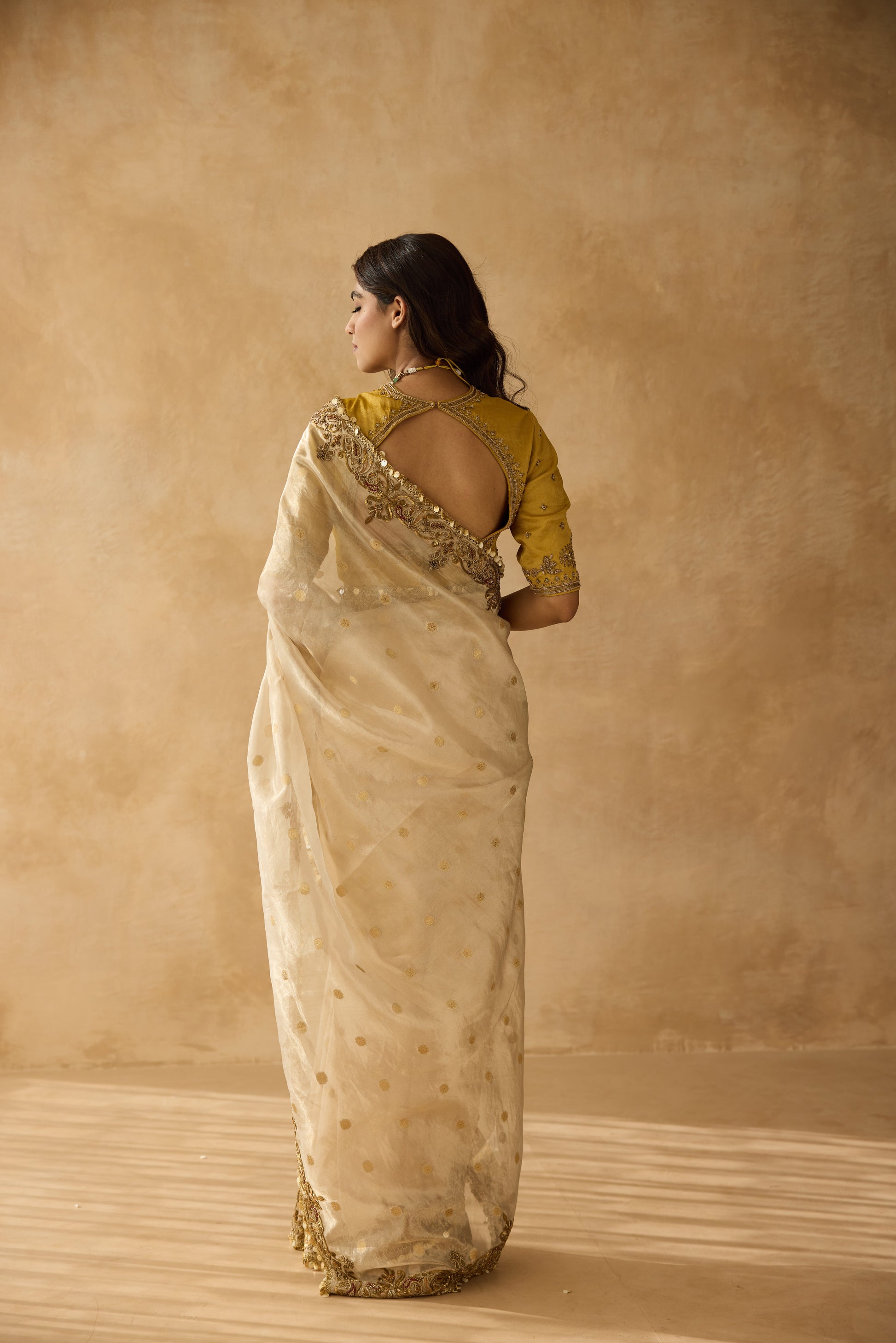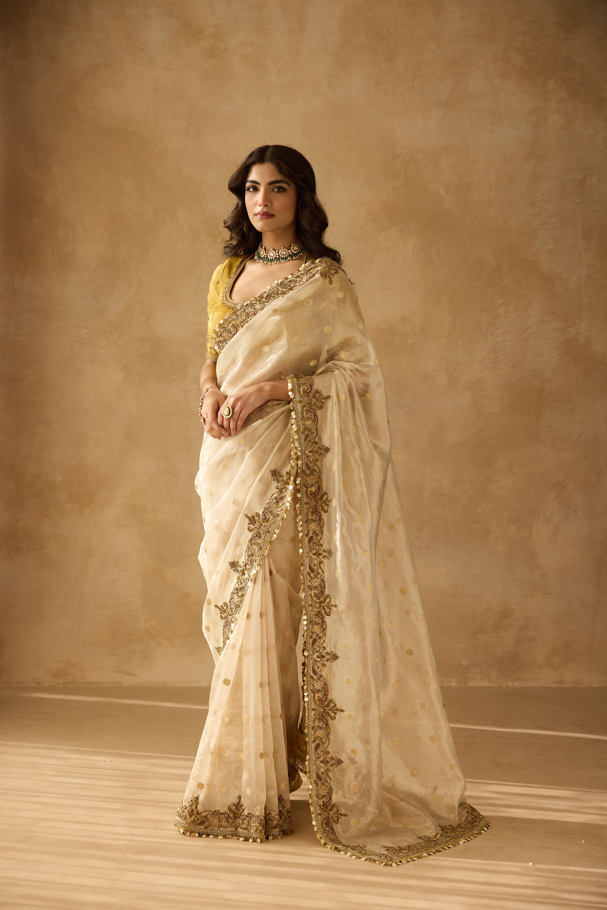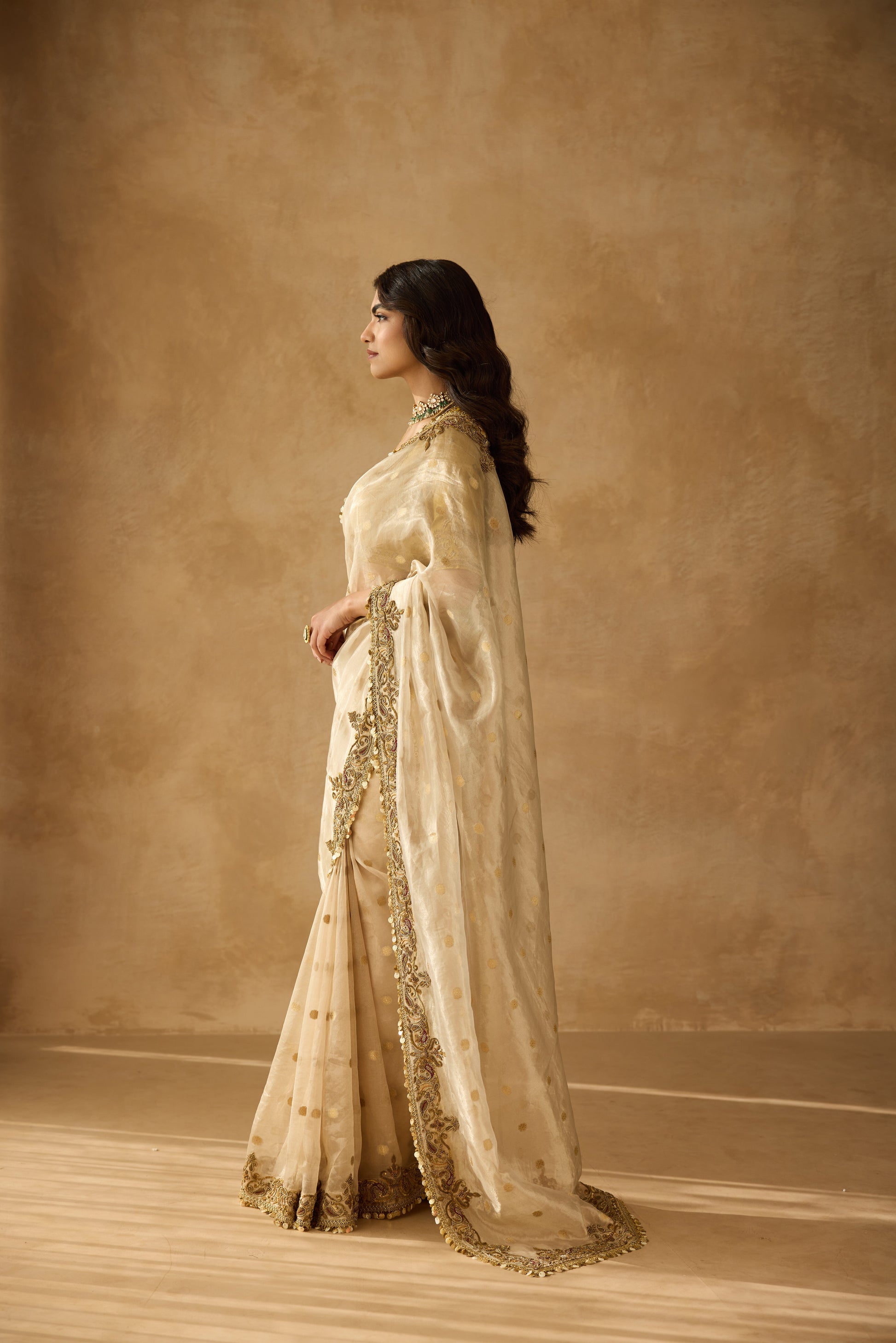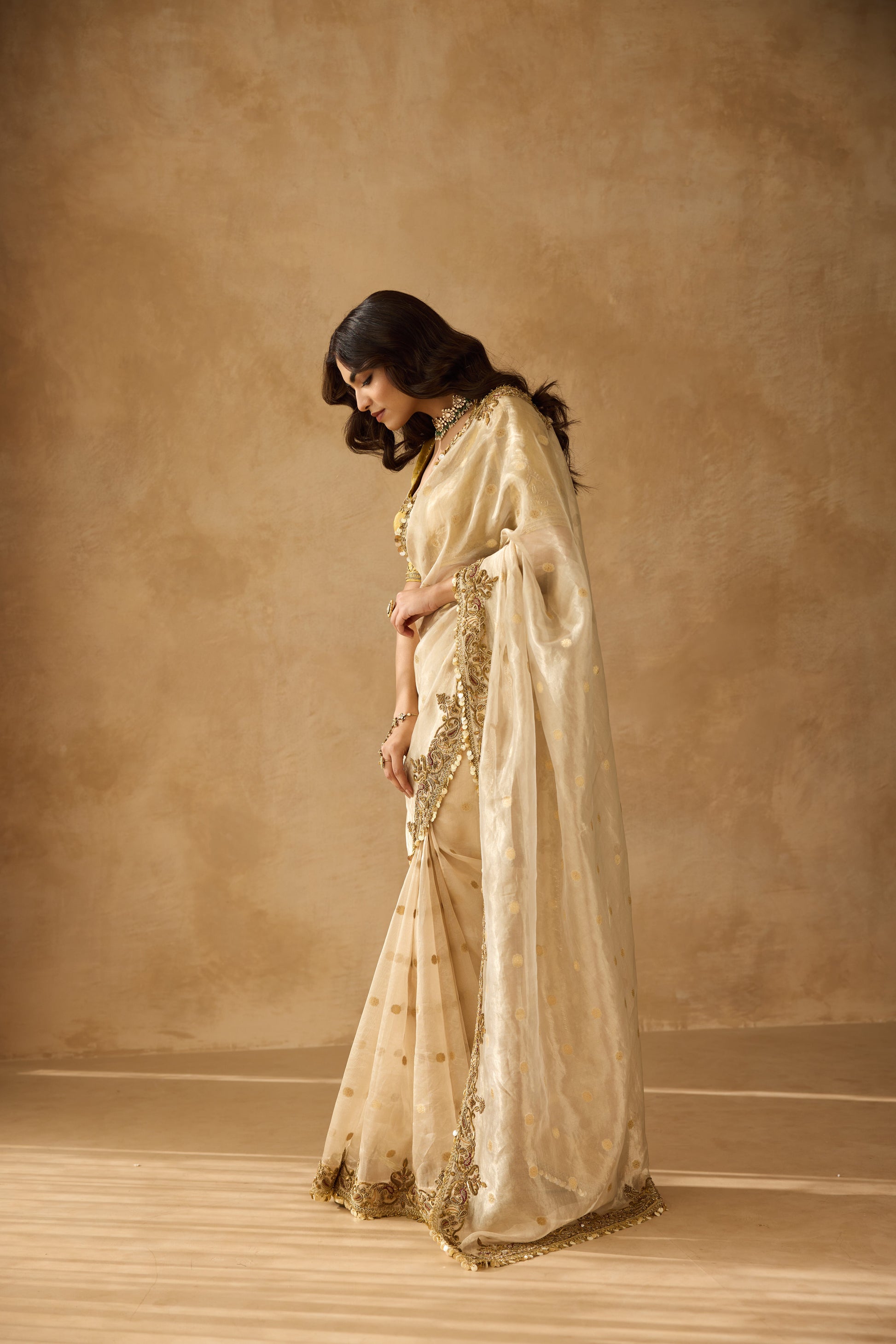 Noor is a radiant cream tissue saree highlighted with delicate antique gold embroidery and a finely detailed border. Light, graceful, and timeless, it reflects a soft glow of elegance and handcrafted beauty.